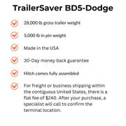The BD5D Air-Ride fifth-wheel hitch fits the factory-installed Dodge OEM fifth-wheel Prep System. It has a 28,000 lb gross trailer weight, a 5,000 lb pin weight, and a heavy-duty 4-way pivoting hitch head with a safety lock. Trailersaver fifth-wheel hitches now feature Air Lift Pro Series airbags. Made in the USA.